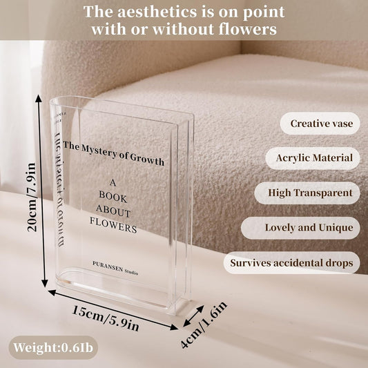 Clear Book Flower Vase - Floral Bookshelf Decor, Acrylic Flower Holder